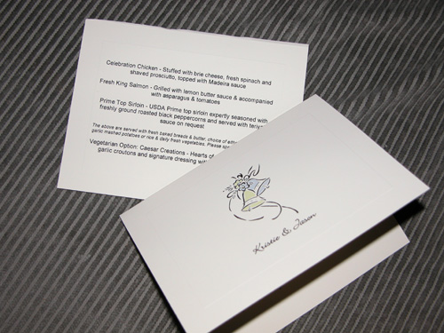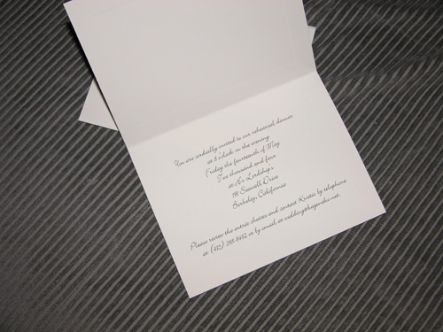 The rehearsal dinner was held the night before the wedding at H's Lordship's in Berkeley. I made up invitations for this and asked people to call or email with their entree choices. Avery matte ivory notecards are wonderful things.