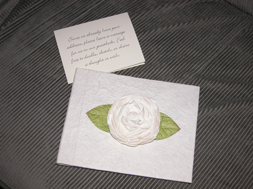 Miscellaneous StuffHere are miscellaneous items for the wedding. We bought the guestbook from Borders. It was unlined so people can doodle or write freehanded in it. We didn't need addresses, but wishes or drawings were nice and plenty of people obliged.