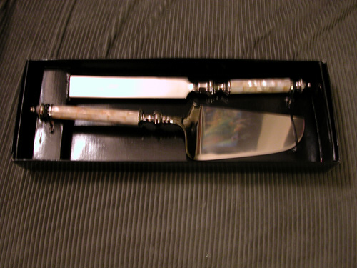 We picked up our cake knife and server rather inexpensively at Z Gallerie in Corte Madera. It's nothing fancy, but we like the shell-look detail on the handles... fitting for people who love the ocean.